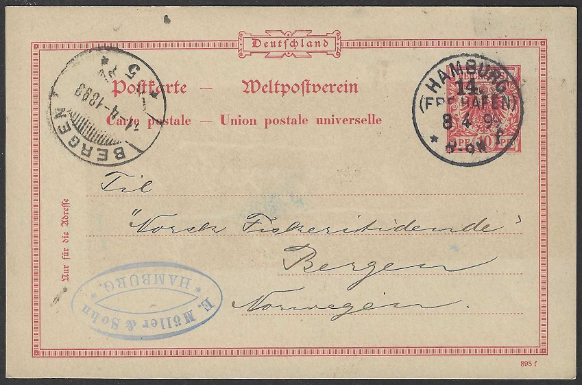10 pf helsak stemplet Hamburg 8-4-1899, st. Bergen Tur 5, 11-4-1899