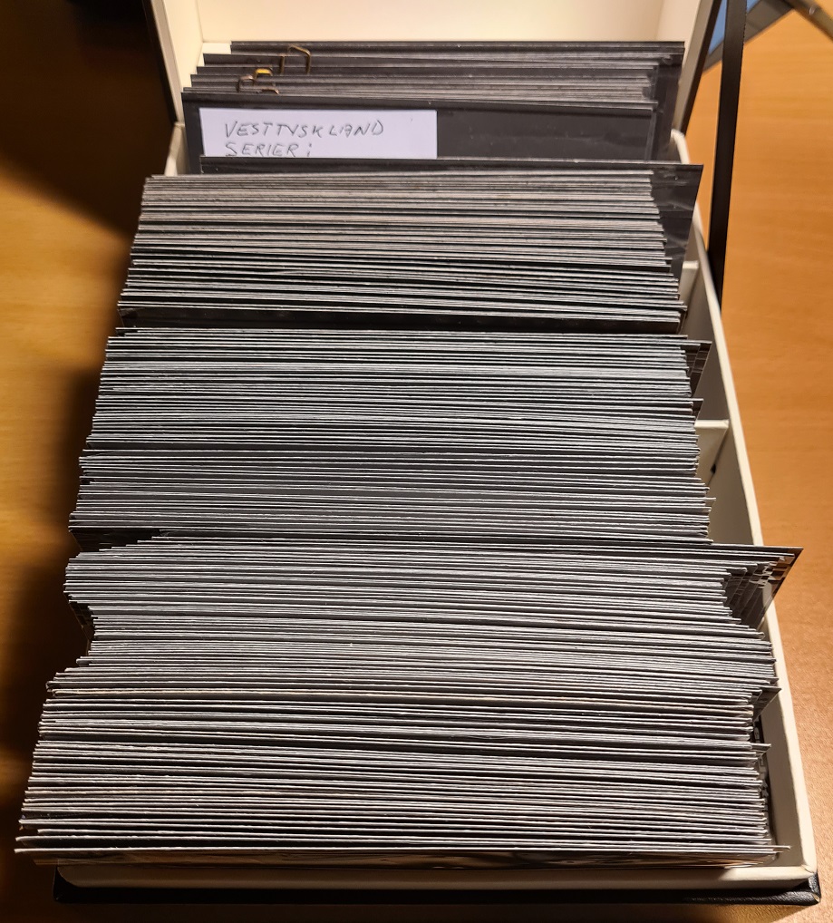 Flott kartotekboks med ca 250 innstikkskort med merker fra
